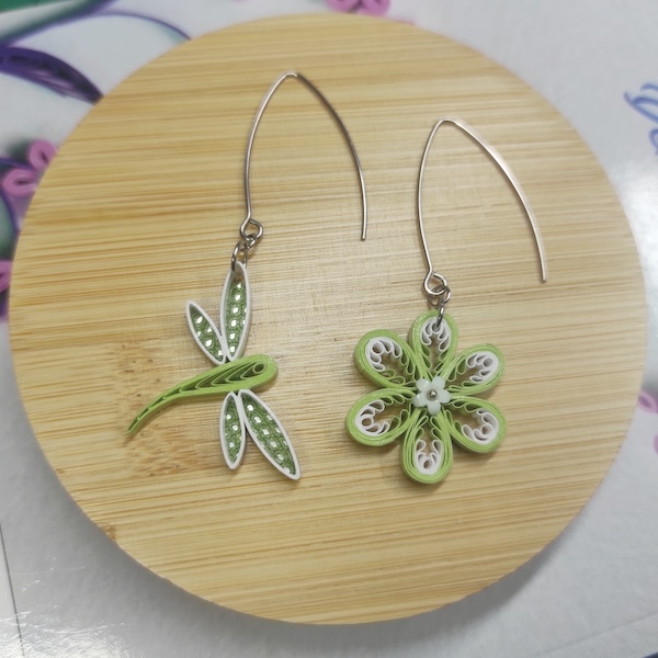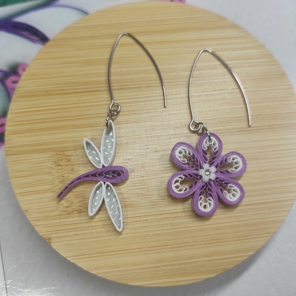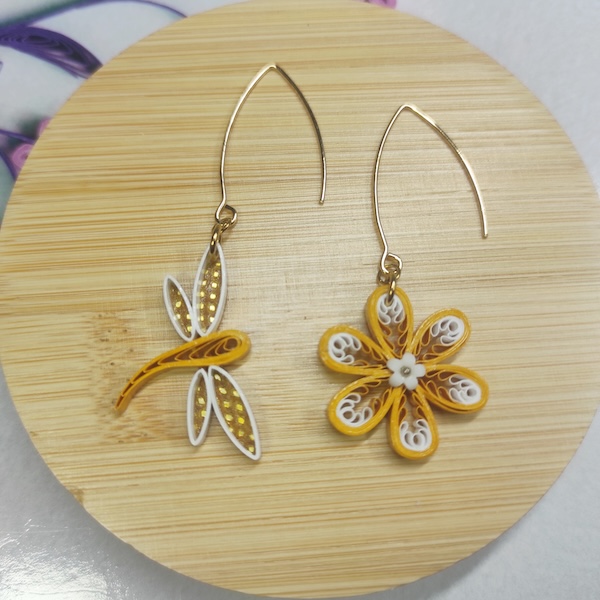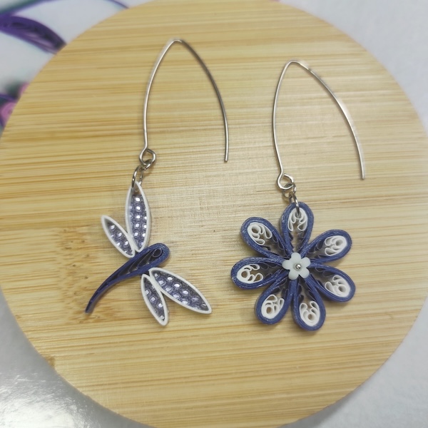 Boucles d’oreilles réalisées à la main avec des bandes de papier de 3 mm de large avec la technique du Quilling (ou paperolles), protégées avec un vernis vitrificateur.