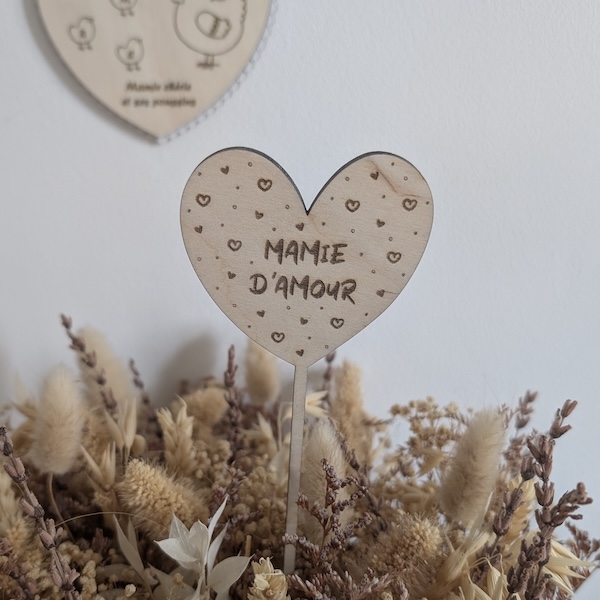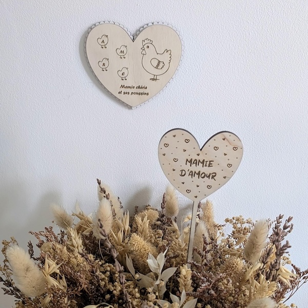Un petit cadeau plein de sens pour la fête des grands-mères : joli cœur en bois gravé avec un message d’amour personnalisable entouré de petits cœurs car il n’y a jamais assez de cœurs pour une grand-mère.