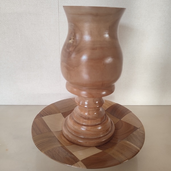Vase en bois de Pommier (H.14cm – Diam.6,5cm) et son assiette en assemblage de cubes de 5 essences : acacia, merisier, charme, hêtre, cerisier sauvage (Diam 14cm).