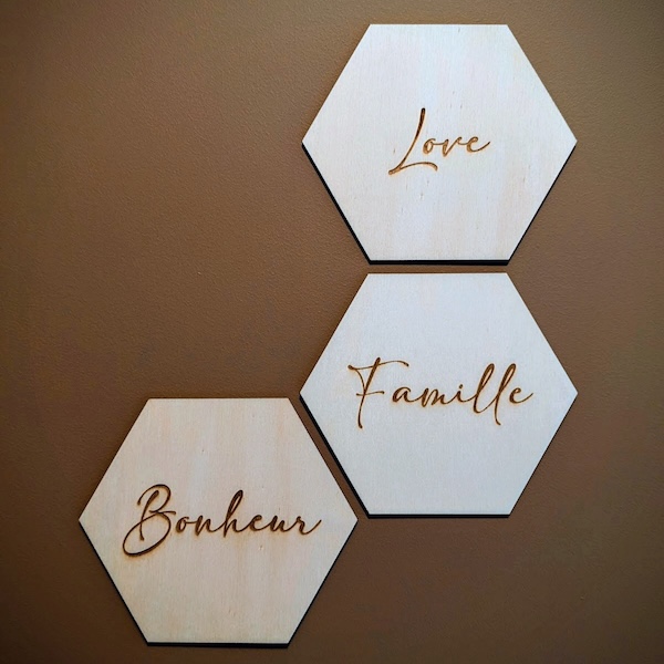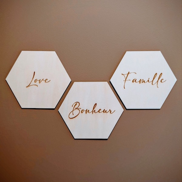 Décoration en bois personnalisable – Hexagone de 14 x 12 cm – Fixation par adhésif double-face Composez votre décoration murale personnalisée en choisissant les mots, noms, dates à graver sur chaque plaque et la police d’écriture. Une belle idée de cadeau personnalisé pour la Saint-Valentin, la fête des grands-mères, un mariage, une crémaillère, une naissance ou tout autre évènement. Fabriqué à la commande, délai 3 jours ouvrés. Important : le bois est un matériau naturel. Chaque pièce de bois présente des variations (couleur, veines, nœuds) qui confèrent au produit final un caractère singulier. Ces différences peuvent également influencer la couleur de la gravure, ce qui rend chaque modèle unique. Les photos sont non contractuelles et peuvent légèrement différer du produit final. Ces variations ne peuvent pas être considérées comme des défauts. 🚚 Livraison uniquement en point relais Mondial Relay (pas de livraison à domicile). Merci d’indiquer votre point relais préféré lors de la commande.