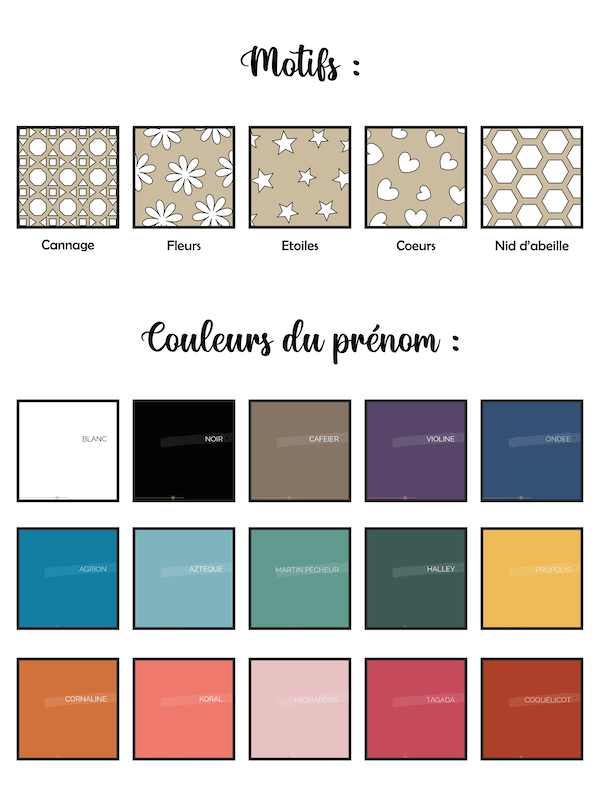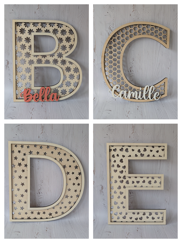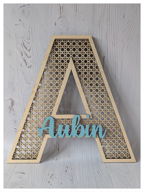 Initiale en bois finement ajourée grâce à la technique de la découpe laser (motif au choix : cannage, fleurs, étoiles, cœurs, nid d’abeille) et ornée d’un prénom ou d’un mot coloré.