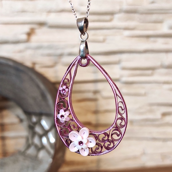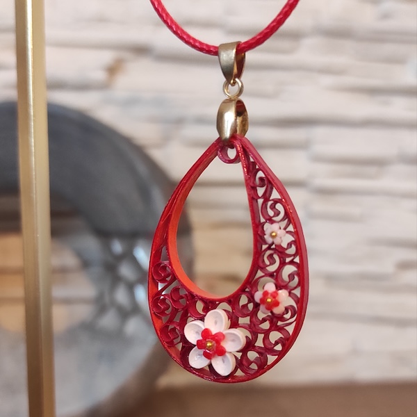Réalisé à la main, avec des bandes de papier de 3mm de large avec la technique du Quilling (ou paperolles). Monté sur cordon en coton ciré ou chaîne en acier inoxydable. Largeur 3cm / Hauteur 4,5cm (sans l’attache). Très léger 3g ! Protégé avec un vernis vitrificateur. Ne craint pas la pluie, l’humidité ou la transpiration. PAS D’IMMERSION DANS L’EAU. Produit unique fabriqué à la commande, d’autres couleurs disponibles sur demande. Délai de fabrication : 10 jours