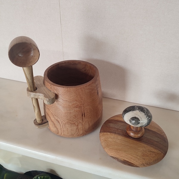 Pot en Frêne – couvercle assemblage Noyer, Acacia, Frêne – Bouchon réalisé avec un galet