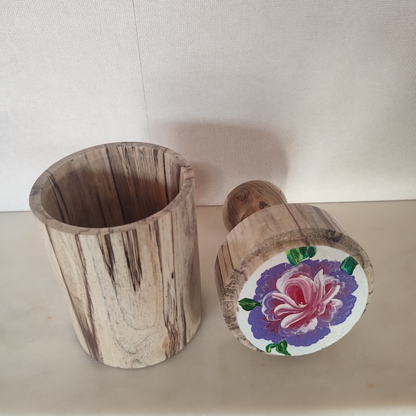 Bouton en acacia – décor rose à l’intérieur du couvercle