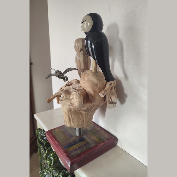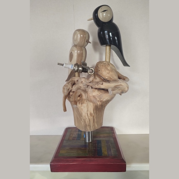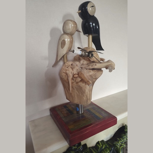 Souche conifère, Colibri bougie de voiture + métal, Oiseau noir en charme peint, Oiseau en assemblage essences charme et noyer.