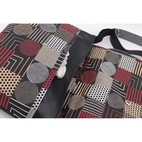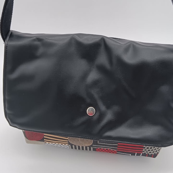 Sac bandoulière réglable qui se porte à l’épaule en simili-cuir noir brillant.